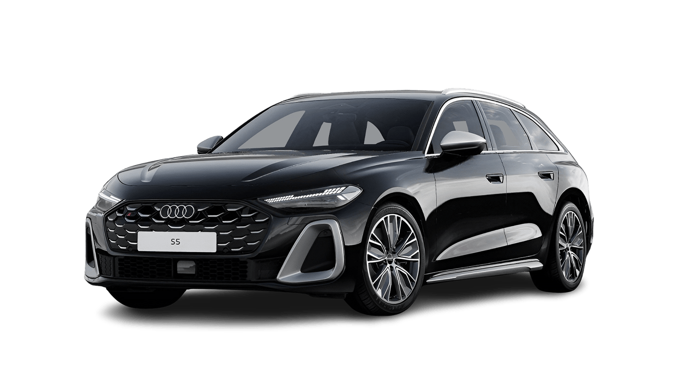 (gegenüber dem Audi A5 mit Standardfahrwerk) / verbreiterte Schwellerleiste in Schwarz / Außenspiegelgehäuse in Wagenfarbe / Fensterzierleisten Aluminiumoptik / Dachreling Aluminiumoptik (nur für A5 AvantStoßfänger S line / S-Diffusor in Phantomschwarz / Einleger Diffusor in Chromoptik matt anthrazit] - Modellkennzeichnung am Heck